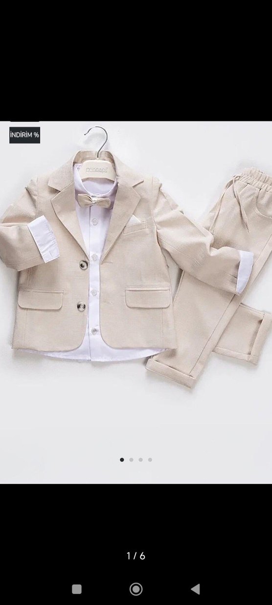 Bej renkli çocuk takımı, modern klasik stilde notalı yaka ve düğmeli ön kısmıyla dikkat çeker. Uzun kollu ceket, uyumlu pantolonla sade bir görünüm sunar. pantolon ceket gömlek ve papyon olarak 4lü takım