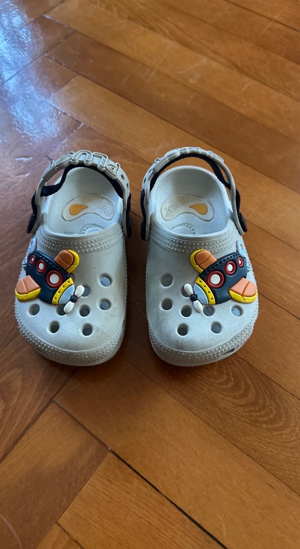 uçak detaylı, kayışlı gri kauçuk erkek çocuk terliği. Yurtdışından alınmıştır. Crocs kalitesinde.