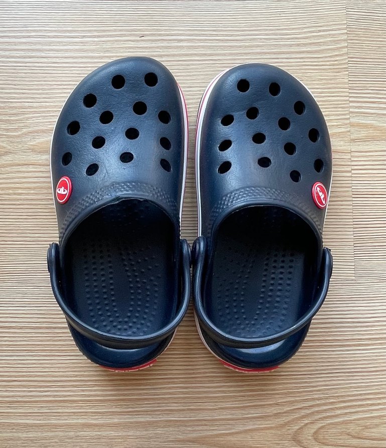 Hiç kullanılmadı. İki tane aynı numara olduğu için bu kaldı.Lacivert, delikli, yumuşak kauçuk malzemeden yapılmış erkek çocuk terliği, ayarlanabilir Velcro bantlı, rahat ve sade tasarım.