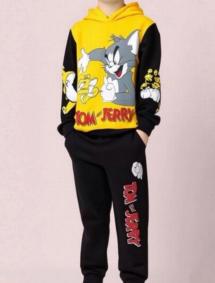 Renkli Tom ve Jerry baskılı, sarı şişme kapüşonlu ve siyah kollu oversize eşofman takımı. Yumuşak ve sıcak kumaştan üretilmiştir.