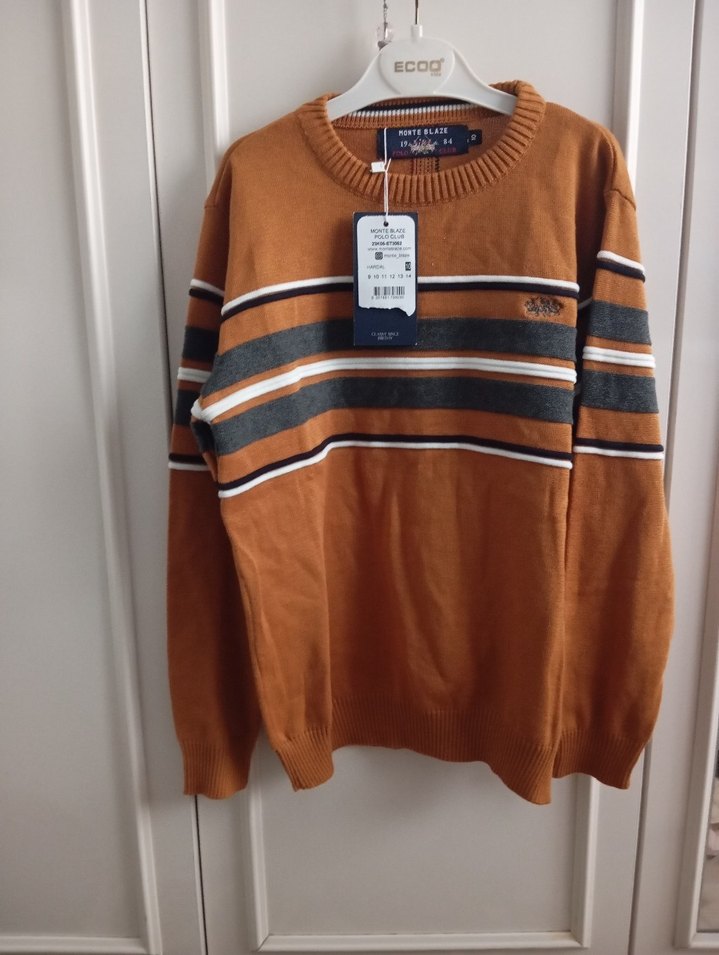 Monto blaze marka hardal rengi erkek çocuk triko kazak, uzun kollu ve bisiklet yaka olup bol kesimdir. Kahverengi ve gri çizgili desenlere sahiptir, yumuşak ve sıcak kumaştan örülmüştür. Günlük sokak stili için uygundur.Marka temsilidir.
