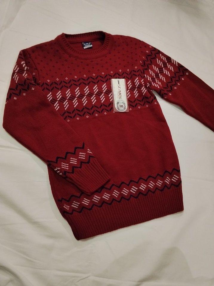 Erkek çocuk için uzun kollu, yuvarlak yaka, örgü dokulu kırmızı kazak. Düzenli kesim ve renkli geometrik desenlere sahip, rahat sokak stili için uygundur.