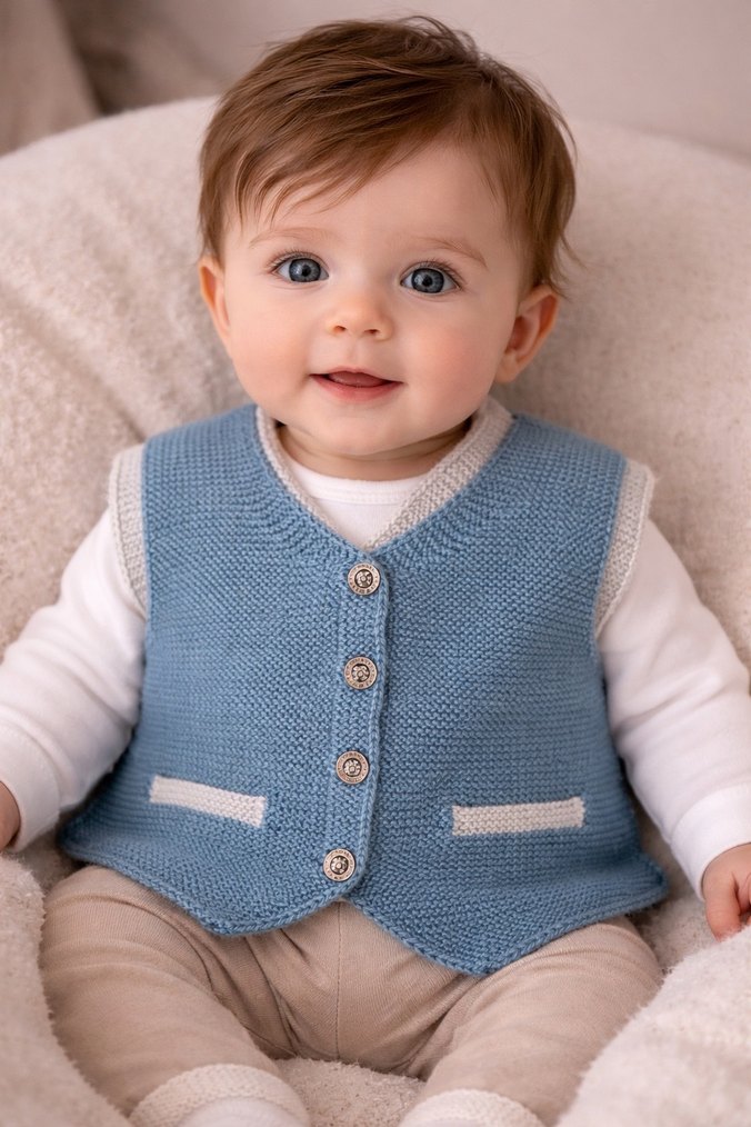 kolsuz örme triko yelek. Regular fit kesimi ve sade deseniyle küçük erkek çocukları için uygundur. Önünde düğmeler ve cep detayları bulunuyor . 9 aya kadar kullanıma uygundur.