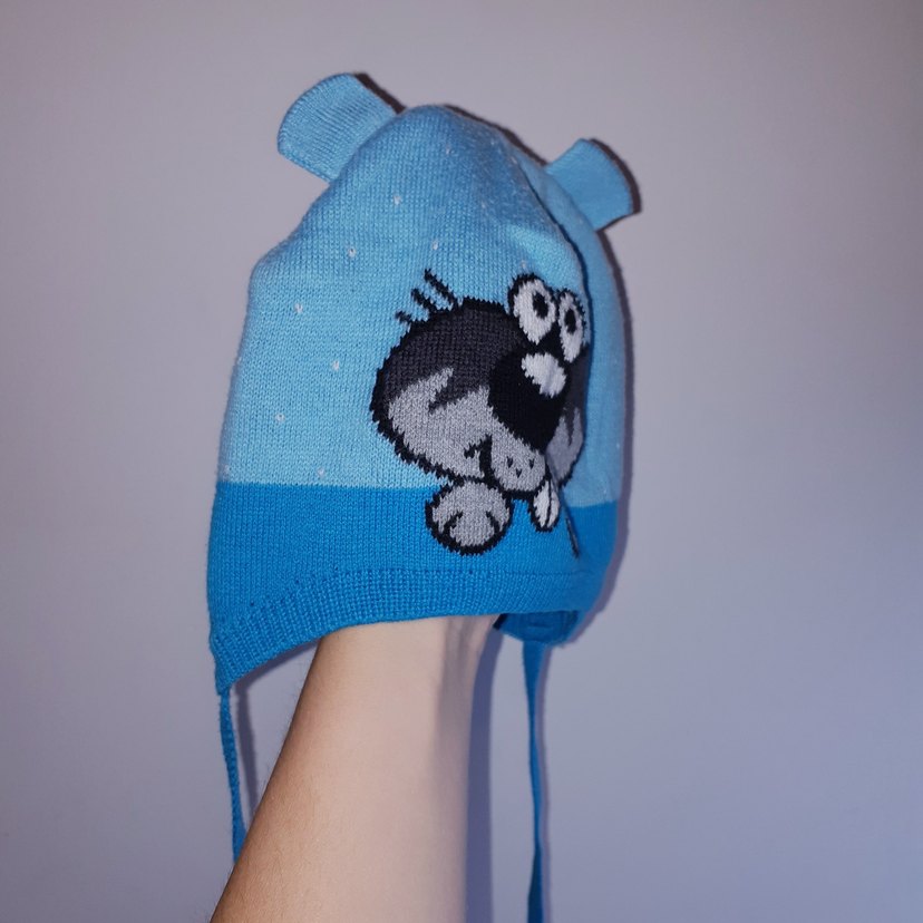 Mavi ve gri renklerde, nakışlı desenli, kulaklıklı erkek çocuk triko beresi. Az kullanılmış sorunsuz defosuz