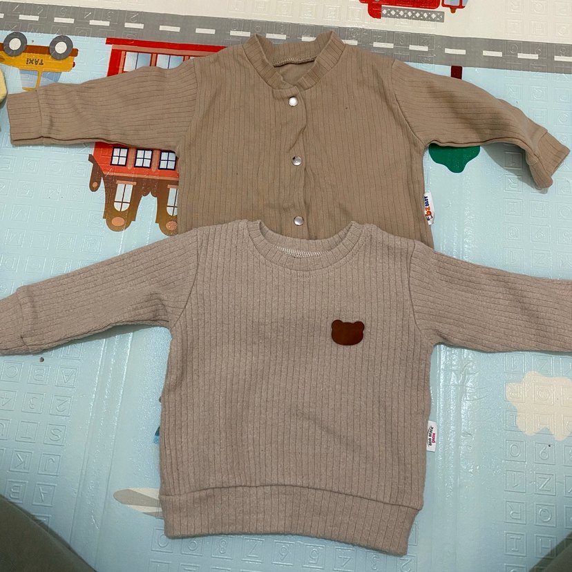 Düğmeli kahverengi triko hırka ve küçük ayı detaylı gri triko kazak, uzun kollu ve bol kesim olarak tasarlanmıştır.