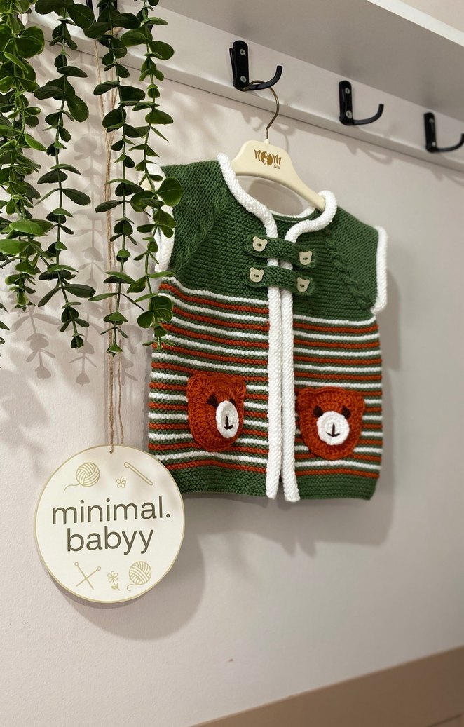 Erkek çocuklar için yeşil renkli, triko, kolsuz ve yuvarlak yakalı, renkli çizgili desenli, sevimli ayı cepli bohem tarzda yelek.