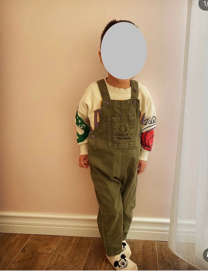 ayarlanabilir tokalı kayışlara sahip erkek çocuk için haki pamuklu tulum. Rahat günlük kullanım için uygundur. İçine hediye olarak bir badi veya sweathirt ekleyeceğim