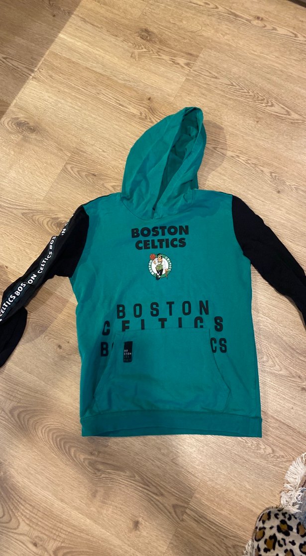 Dar kesim, uzun kollu ve kapüşonlu çocuk sweatshirtü. Koyu turkuaz renkte, Boston Celtics baskılı ve düğmeli detaylıdır.