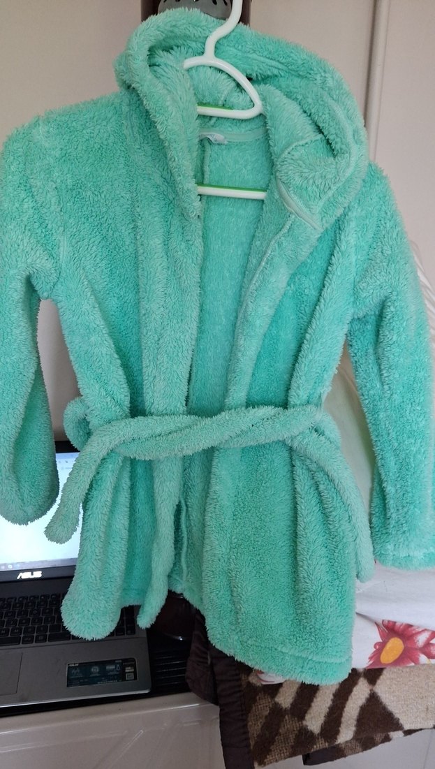 Erkek çocuklar için pastel tonlarda turkuaz bornoz, yumuşak dokulu, kapüşonlu ve kemerli, banyodan sonra rahat kullanım sağlar.