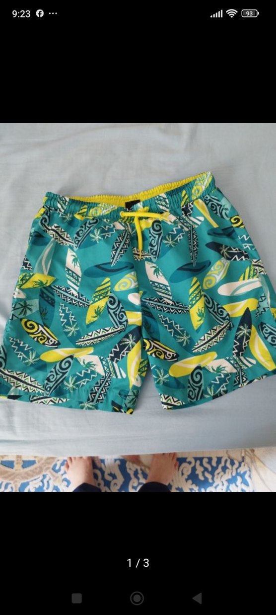 Turkuaz renkli, renkli batik desenli ve ayarlanabilir sarı bağcıklı erkek çocuk deniz şortu. 12_13 yaş