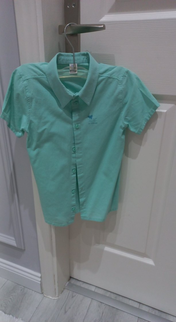 Erkek çocuklar için pastel turkuaz renkte, düğmeli ve yakalı, kısa kollu, vücuda oturan suni kumaştan gömlek.