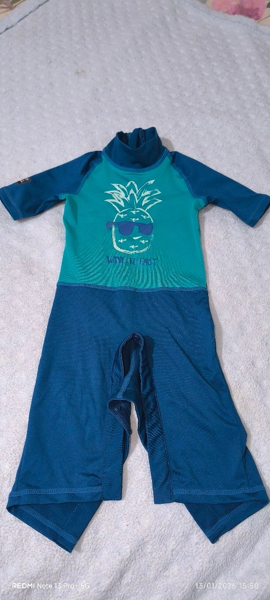 Kısa kollu, turkuaz ve lacivert tonlarda bağlama desenli erkek çocuk mayosu. Önünde güneş gözlüklü ananas figürü bulunur.
