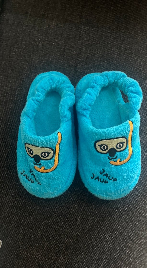 Yumuşak tüylü kumaştan yapılmış, renkli nakışlı ve kolay giyilen velcro kapamalı turkuaz erkek çocuk terliği. Rahat terlik.