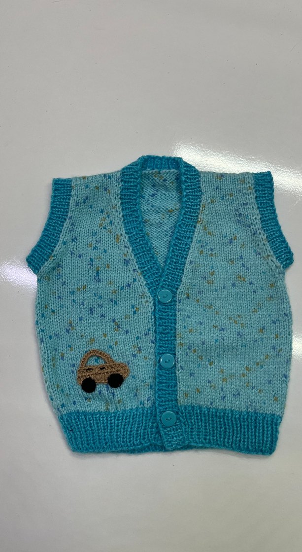 Düğmeli, turkuaz renkli, arabalı küçük motifli erkek çocuk süveteri. Triko örme, kolsuz ve dar kesim, yumuşak dokulu, sokak stiline uygun.
