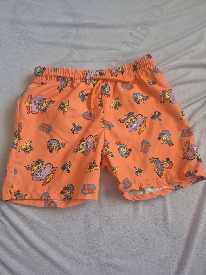 Canlı turuncu renkli, erkek çocuklar için çizgi film desenli ve lastikli bel detaylı mayo şort.