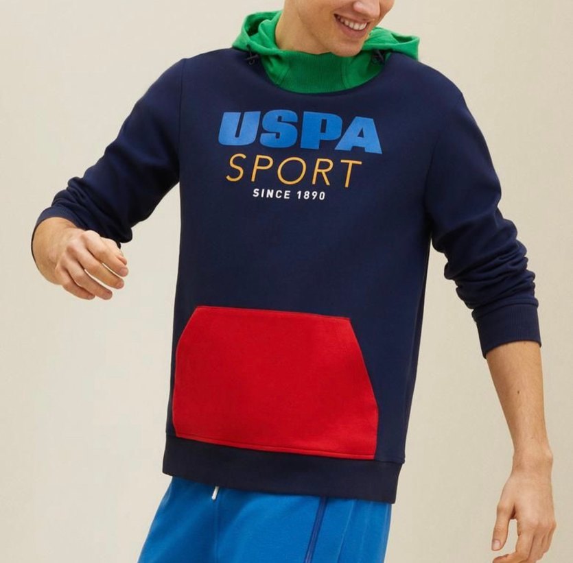 Erkek çocuk için yumuşak kumaştan, uzun kollu, bol kesim sweatshirt. USPA Sport baskılı, koyu mavi renkli, kırmızı ön cepli ve cırt cırt detaylıdır.