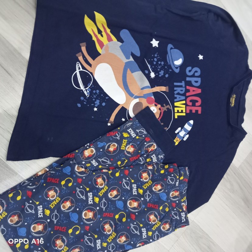 Erkek çocuklar için fitted kesim, koyu mavi renkli, uzay temalı baskılı kısa kollu pijama takımı. Üstü yuvarlak yaka, altı desenli pantolonlu.