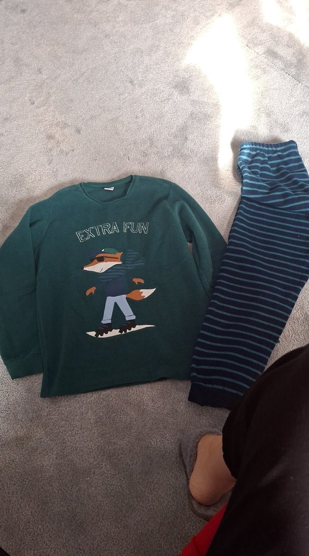 Erkek çocuklar için bol kesim, uzun kollu ve yuvarlak yakalı pijama takımı. Koyu yeşil üstte kürklü tilki baskısı ve "EXTRA FUN" yazısı bulunur. Alt ise koyu mavi çizgili desenlidir.