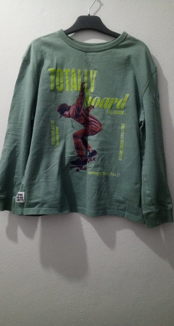 Erkek çocuk için uzun kollu, bisiklet yaka ve bol kesim sweatshirt. Yeşil-gri renkli, yumuşak ve sıcak kumaş üzerine baskılı kaykay deseni içerir.