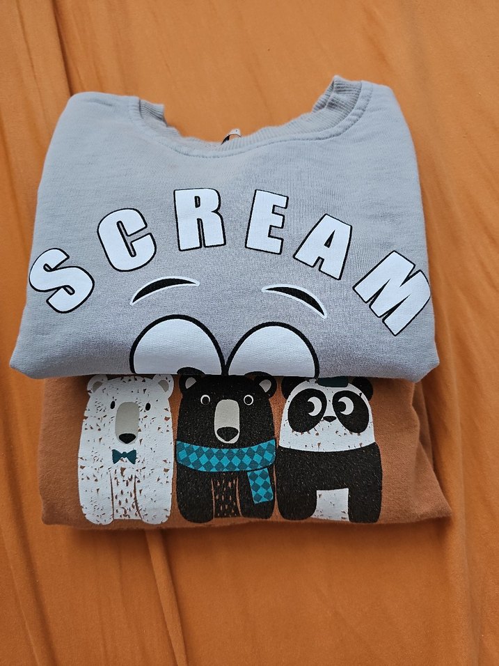 Erkek çocuklar için uzun kollu, bisiklet yaka, baskılı sweatshirt. Yumuşak kumaştan, bol kesim ve örme detaylı, sokak stiline uygun. Gri ve kahverengi, sevimli hayvan desenli. ikili fiyatıdır. gri olanlda belirsiz leke var