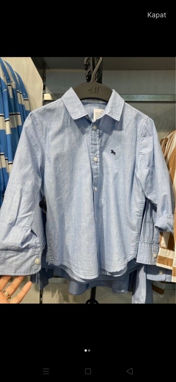 Erkek çocuklar için uzun kollu, düğmeli ve yakalı denim gömlek. Rahat kesimi ve açık mavi rengiyle günlük sokak stiline uygundur. bir iki kere giyildi