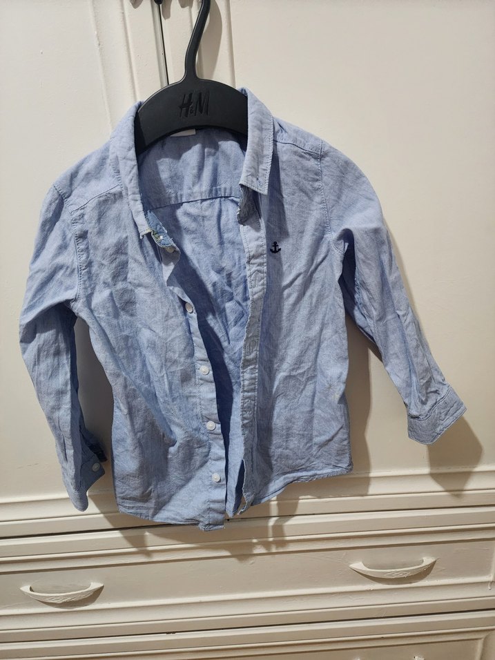 Erkek çocuklar için uzun kollu, yakalı ve düğmeli denim gömlek. Gri-mavi tonlarında, regular fit ve streetwear tarzında.
