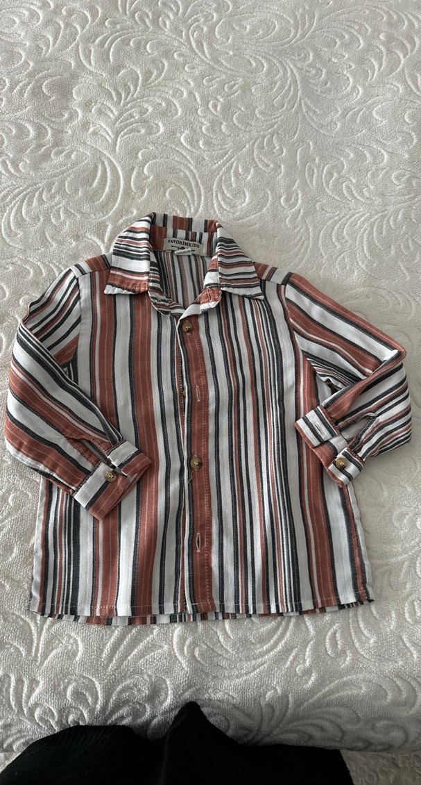 Erkek çocuk için uzun kollu, düğmeli ve yakalı gömlek. Gevşek kesim, kahverengi ve gri tonlarda çizgili desenli, bohem tarzda.hiç giyilmedi