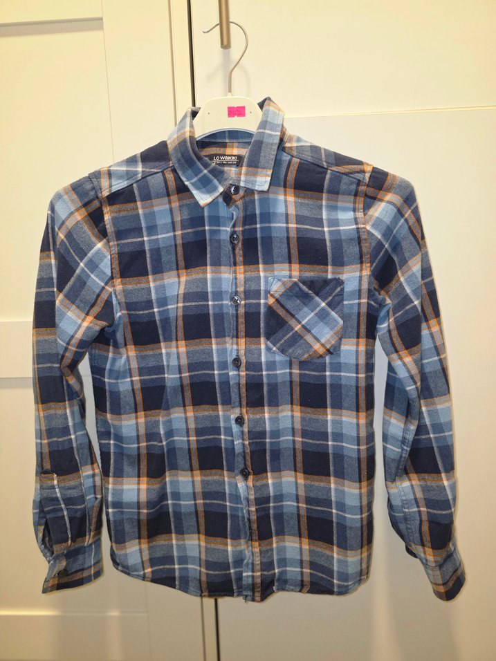 Erkek çocuklar için düğmeli, uzun kollu ve yakalı oduncu pamuk gömlek. Gri ve mavi tonlarında batik desenli, rahat kesim ve trend sokak stili için uygun.