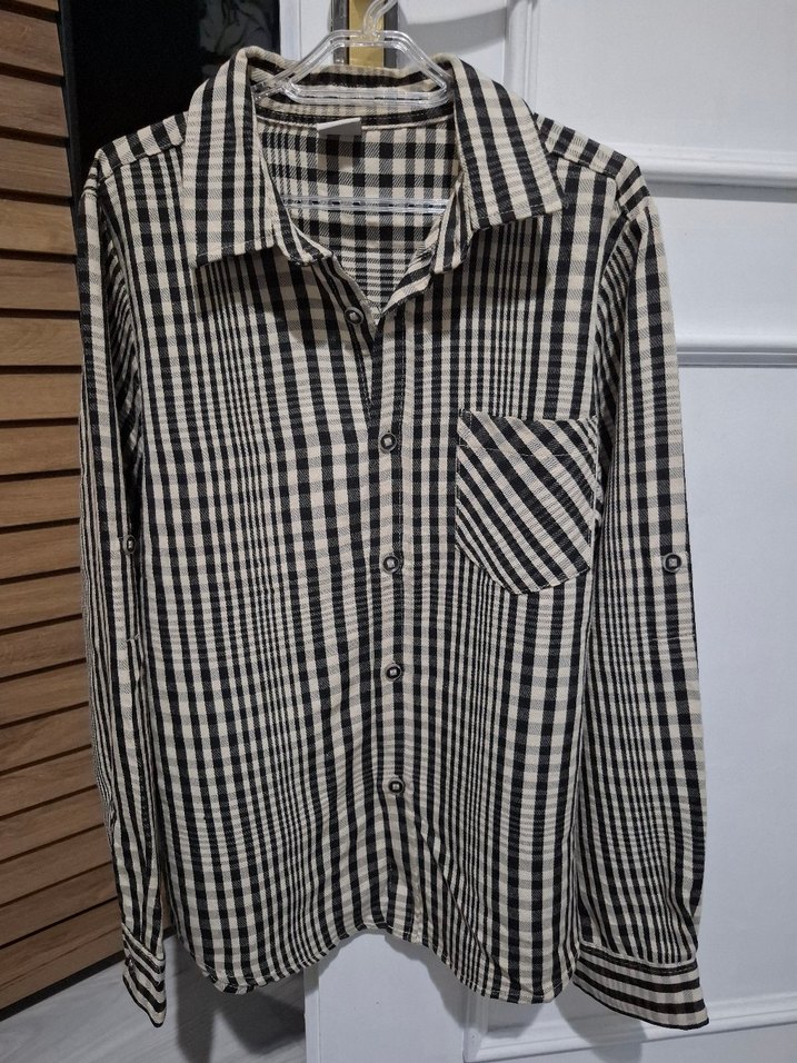 Bej ve siyah ekose desenli uzun kollu gömlek, yakalı ve düğmeli. Sentetik kumaştan, rahat kesim, günlük sokak stiline uygun. Göğüs cebine sahip.