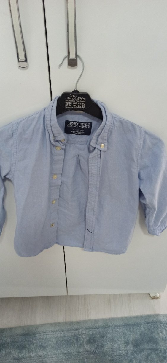 Zara marka düğmeli, yaka detaylı, uzun kollu, bol kesim mavi gömlek.