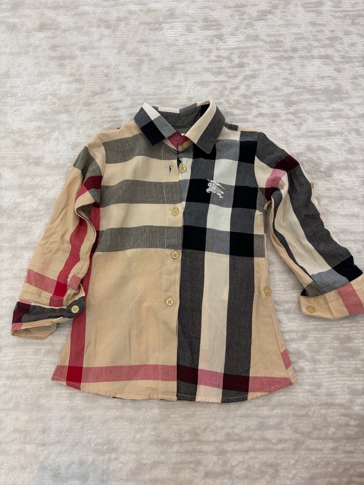 Pamuklu, uzun kollu, düğmeli erkek çocuk gömleği.