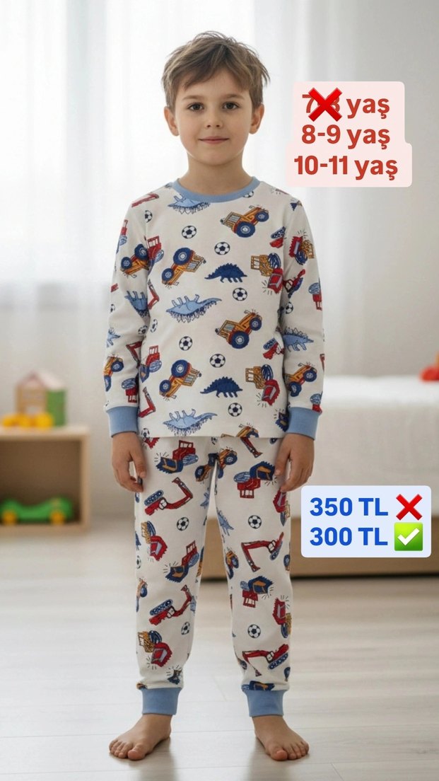 Erkek çocuklar için bol kesim, uzun kollu, bisiklet yaka pamuklu pijama takımı. Hafif çok renkli zemin üzerinde inşaat araçları deseni bulunur. Örme yumuşak kumaştan üretilmiştir. 8-11 yaş arası için uygundur. ️