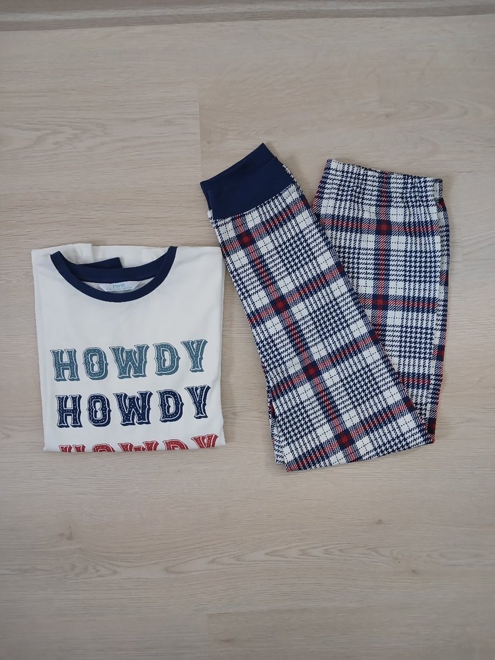 Erkek çocuk pijama takımı, uzun kollu, bisiklet yaka ve "HOWDY" baskılı üst ile kareli desenli pantolondan oluşur. Rahat kesimlidir. Ust beden 9-10 yaş, alt pijama 8-9 yaş olculeri fotograflarda mevcuttur