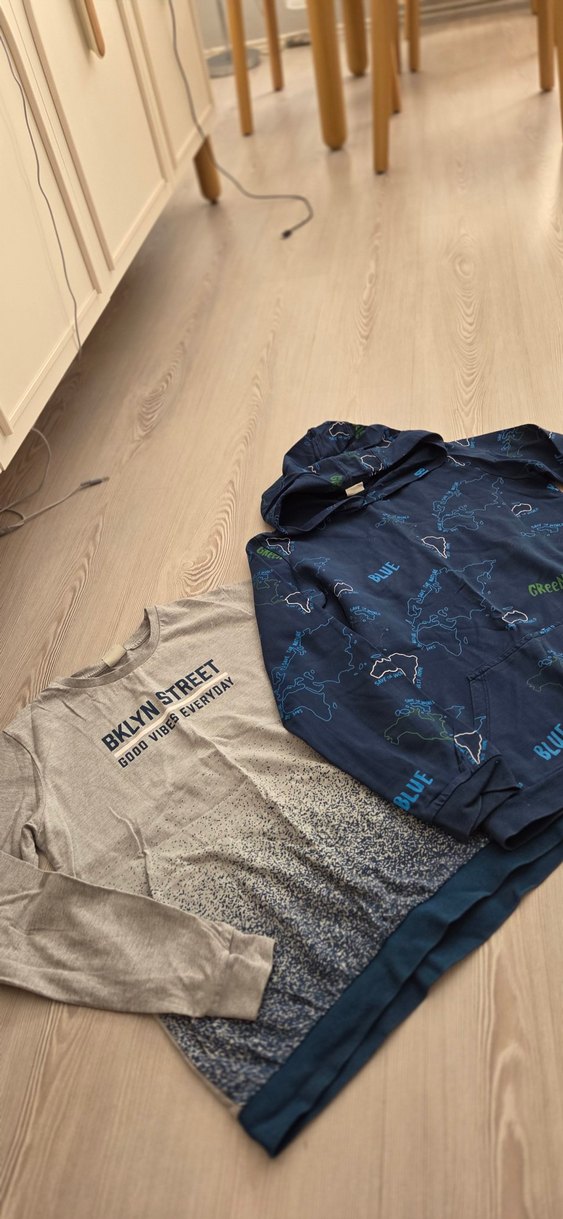 Gri ve mavi tonlarda, yumuşak örme kumaştan, uzun kollu ve baskılı desenli, bol kesim erkek çocuk sweatshirtü.