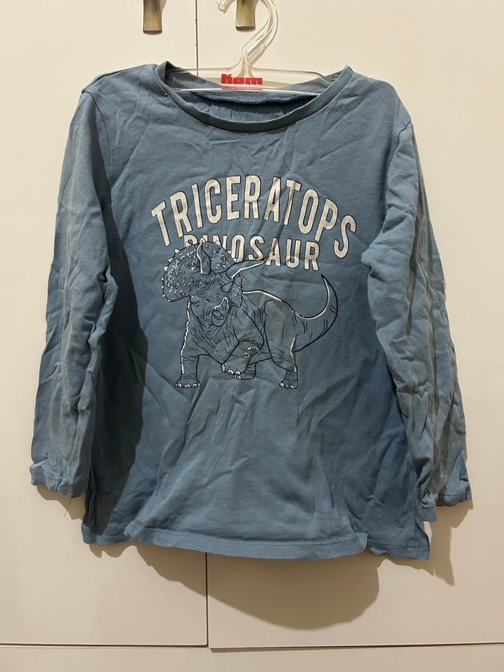 Sorunu yoktur sadece ütüsüzdür , uzun kollu, bisiklet yaka ve bol kesim denim sweatshirt. Üzerinde Triceratops baskısı bulunur.