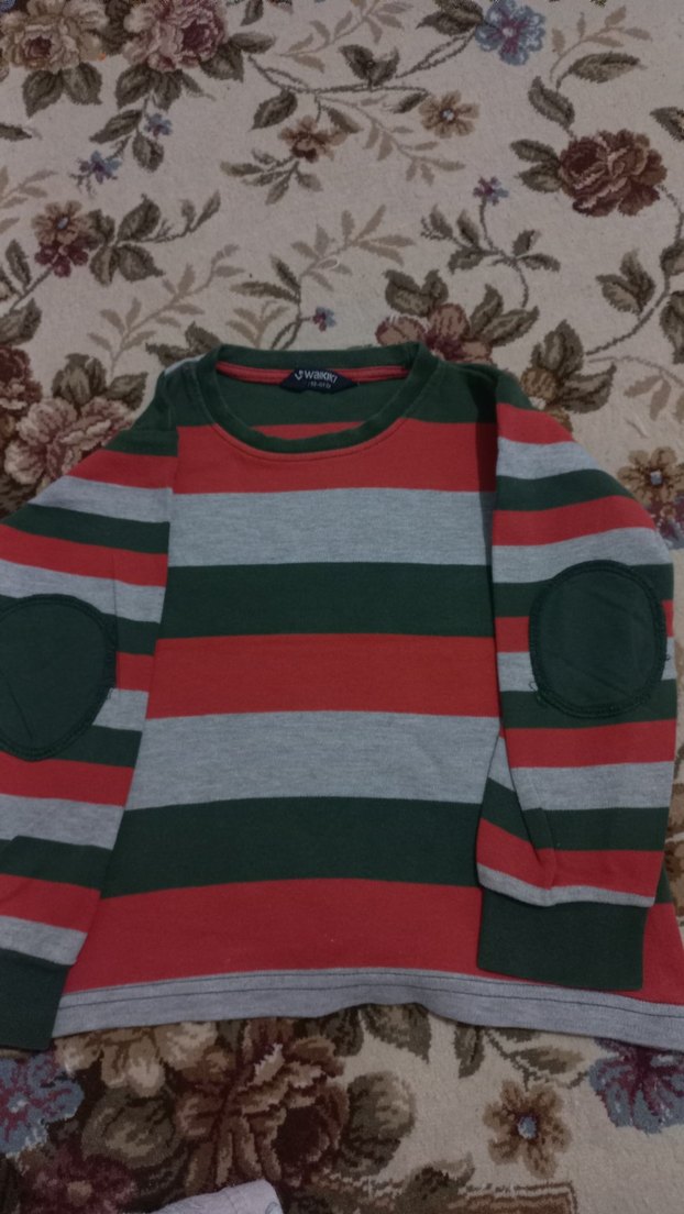 Erkek çocuk için uzun kollu, yuvarlak yakalı, gevşek kesim Gri, yeşil ve kırmızı çizgili desen ve dirsek yaması detaylarıyla trendy sokak stili için uygun.