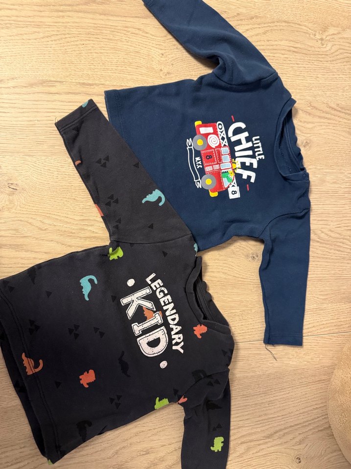 Erkek çocuklar için uzun kollu, bol kesim sweatshirtler. Biri mavi, renkli baskılı ve cırt cırtlı, diğeri koyu renkli desenli ve yazılı. Her ikisi de bisiklet yaka ve yumuşak kumaşlıdır.