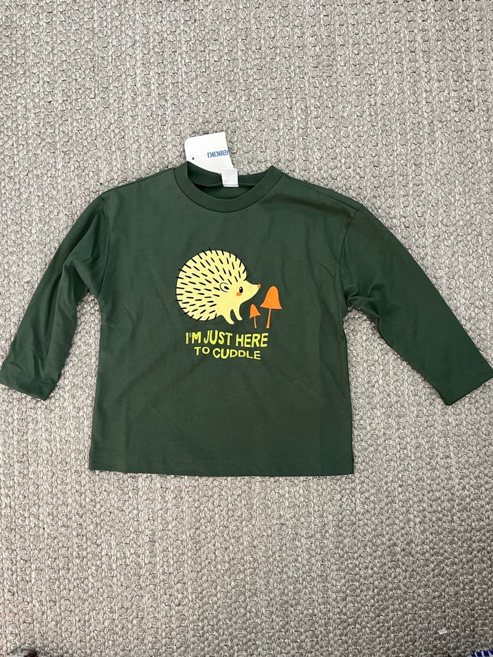 Erkek çocuk için uzun kollu, yuvarlak yakalı, yumuşak kumaştan yapılmış yeşil sweatshirt. Bol kesim, örgü dokulu ve önünde 'I'm just here to cuddle' yazılı sevimli kirpi baskısı bulunur. #lcw #kids #bebek #yeşil #uzun #kollu #tişört #bebek #çocuk