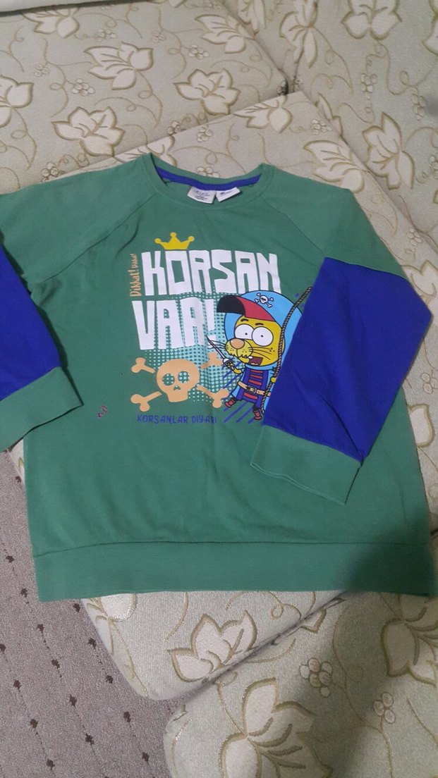 Erkek çocuk için uzun kollu, velcro detaylı, yeşil renkte yumuşak kumaştan sweatshirt. Renkli baskılı ve bol kesim.Az giyilir, yeniden farksız. Kral Sakir.