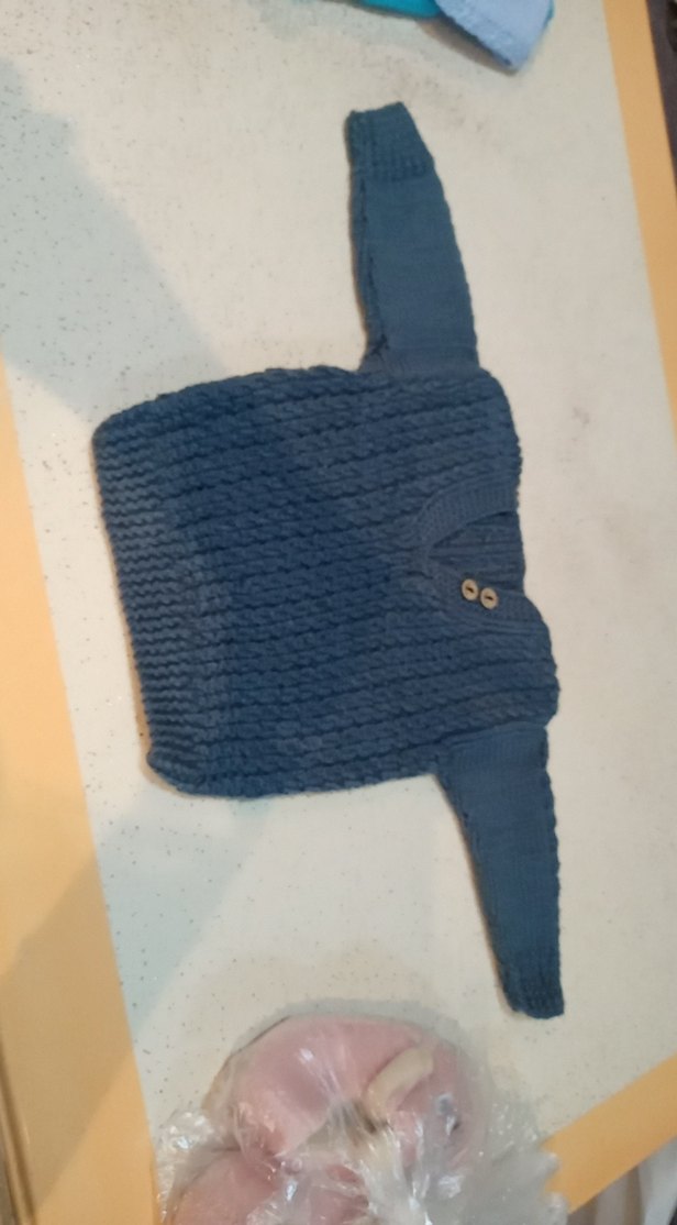 Erkek çocuklar için V yaka ve uzun kollu, triko el örgüsü yapılmış mavi renkli, sade ve düz desenli, vücuda oturan kazak.