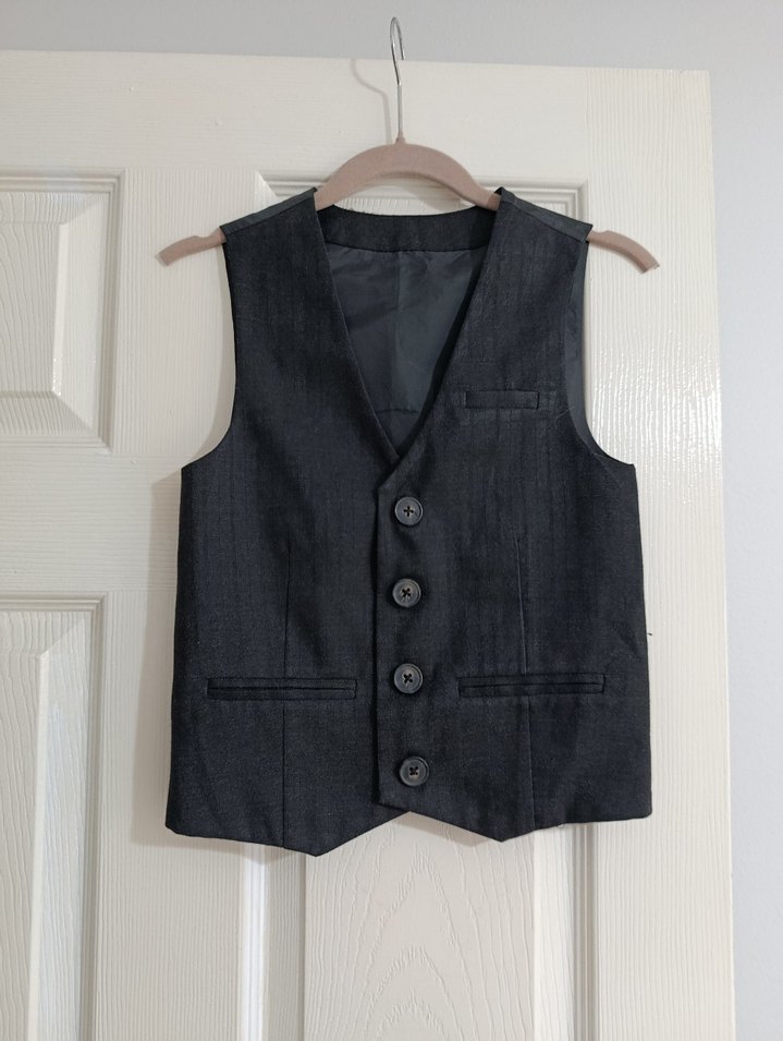 Siyah renkte, düğmeli erkek çocuk denim yelek. Kolsuz, çentikli yaka ve regular fit ile sade bir tasarıma sahiptir. 7-8 yaş ile uyumludur en33 cm boy46 cm dir #yelek#klasik#erkek#çocuk