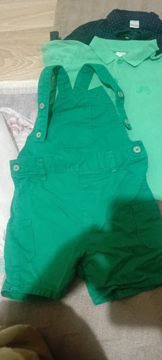 Erkek çocuklar için yeşil askılı kısa tulum, düğmeli ve vücuda oturan renkli sentetik kumaştan üretilmiştir. Fiyat her iki parça içindir. Alıcıya bol şans; çok temizler.