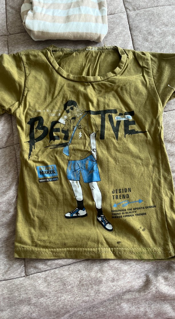 Sentetik kumaştan, bel detaylı, renkli baskılı, yeşil renkli, kısa kollu, bol kesim erkek çocuk tişörtü. Birinde leke vardır