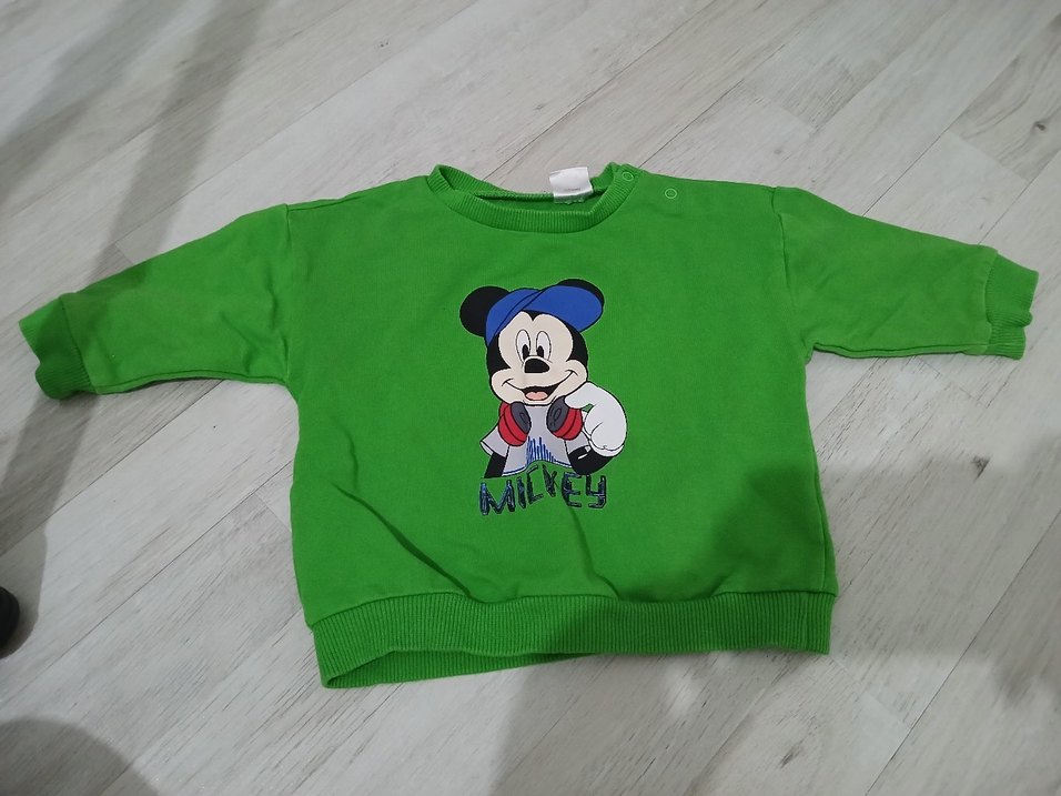 Yeşil renkli, bisiklet yaka ve uzun kollu erkek çocuk sweatshirtü. Renkli Mickey Mouse baskısı vardır. Yumuşak ve sıcak kumaştan, bol kesimdir.