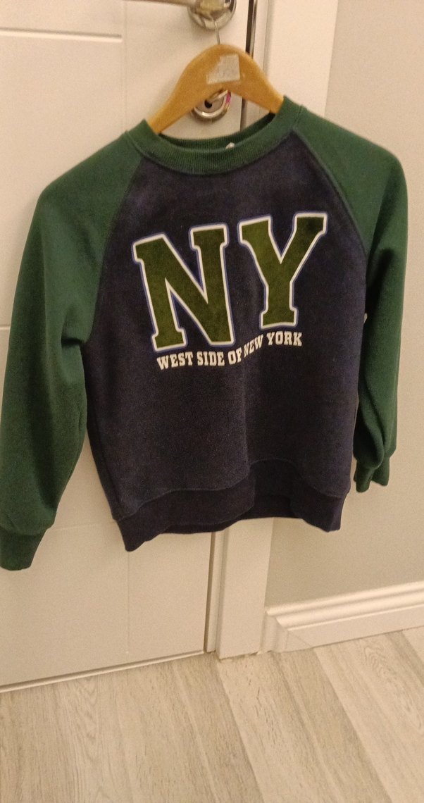 Erkek çocuk için yuvarlak yaka, uzun kollu, yumuşak ve sıcak kumaştan yapılmış rahat kesim sweatshirt. Baskılı NY toplam veya 6 kere giyildi