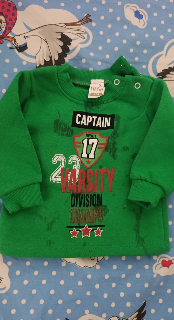 Uzun kollu, bisiklet yaka ve düğmeli omuz detaylı, soft kumaştan erkek çocuk yeşil sweatshirt. Renkli varsity temalı baskılar ve rahat kesim sunar.