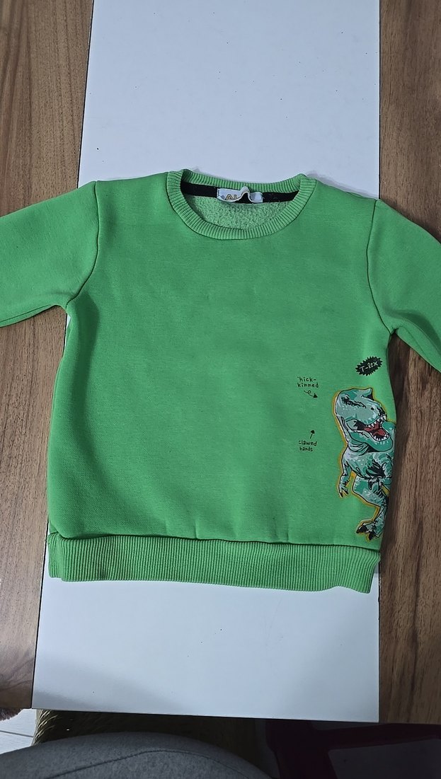 Erkek çocuklar için yuvarlak yakalı, uzun kollu ve bol kesim yeşil sweatshirt. Yumuşak ve sıcak kumaştan, renkli dinozor baskısı ve örme detaylarla dikkat çekiyor.
