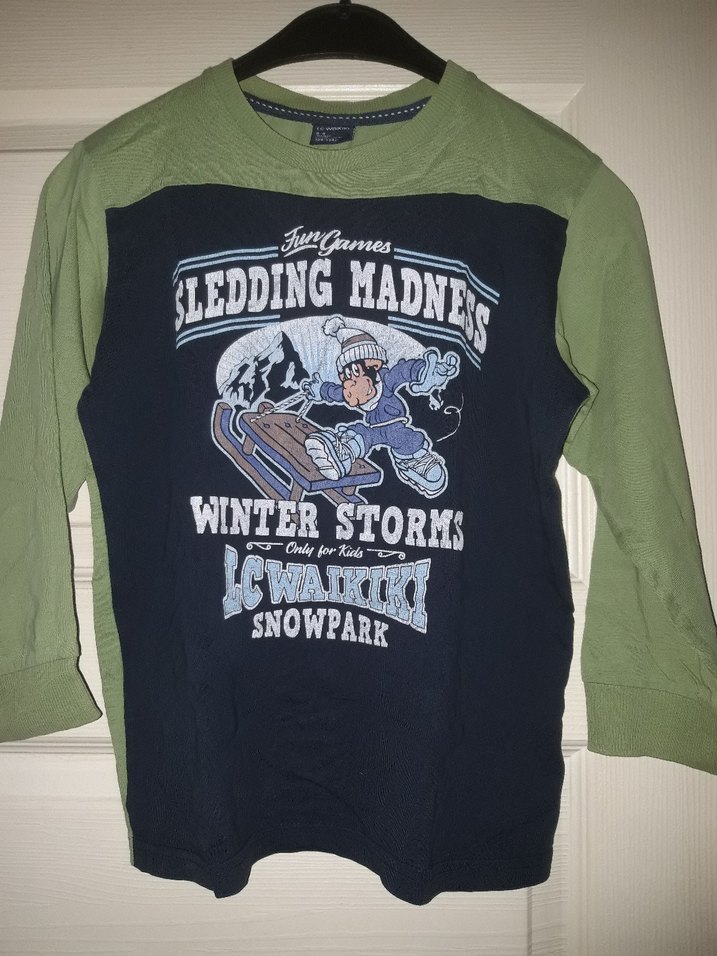Erkek çocuk için uzun kollu, yuvarlak yaka ve bol kesim sweatshirt. Yumuşak ve sıcak kumaştan, örme dokulu, koyu yeşil ve lacivert baskılı kış temalı desenli. ❄️
