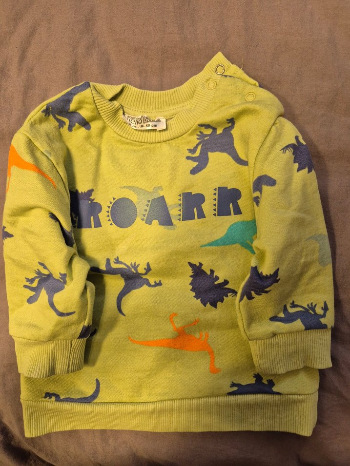 Uzun kollu, bisiklet yaka, bol kesim yeşil sweatshirt. Örme, yumuşak ve sıcak kumaştan, dinozor baskılı.