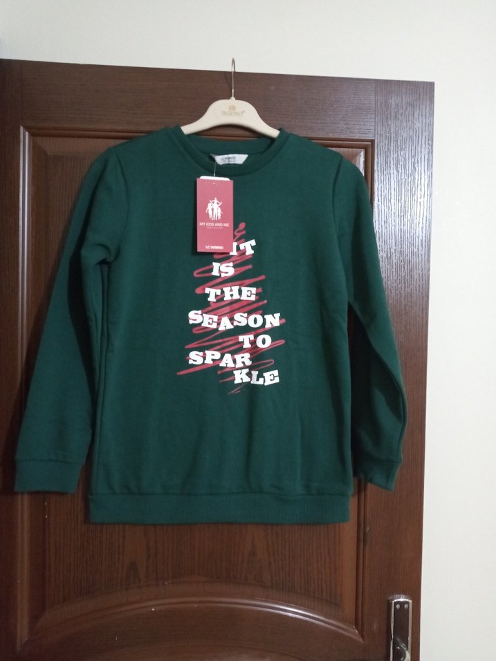 Erkek çocuk için uzun kollu, yuvarlak yaka ve örgü dokulu yumuşak kumaştan yapılmış yeşil renkli, bol kesim sweatshirt. Üzerinde 'It is the season to sparkle' baskısı bulunur. 12-14 yaş